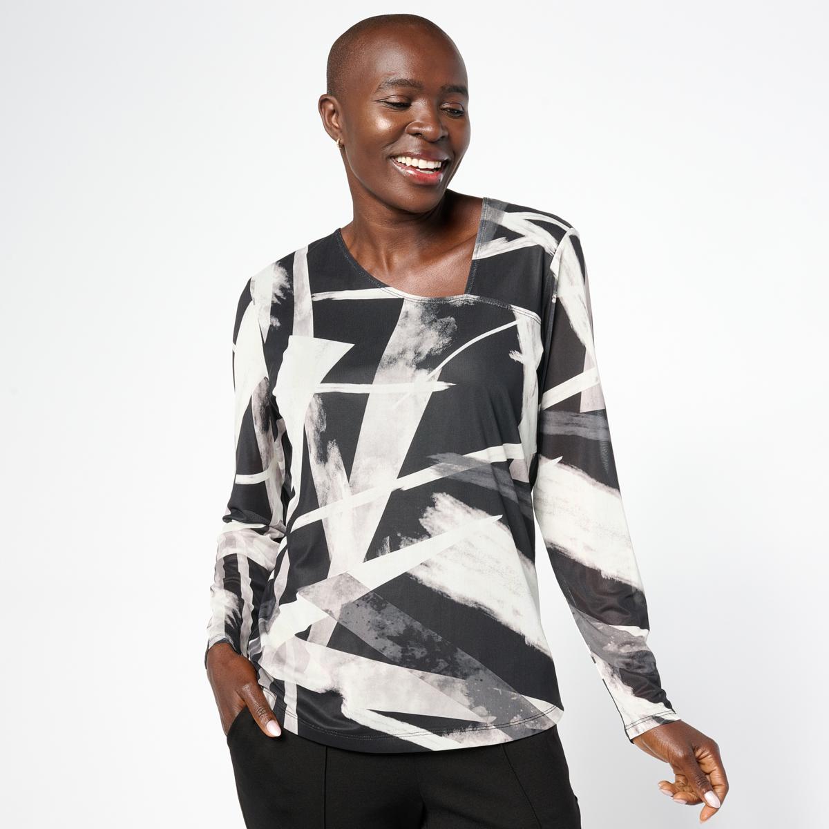 This top features a unique asymmetric neckline and set-in long sleeves crafted from stretch mesh knit fabric, offering a flattering fit with a slight contour at the waist. Providing both style and comfort with a modern edge, it's perfect for layering or wearing on its own.