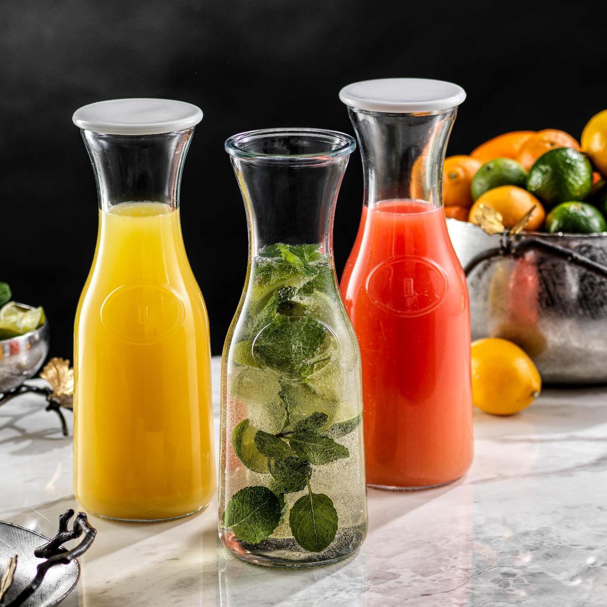 Host The Perfect Party with The Hali Carafe, Mimosa Carafe Set from JoyJolt! Every host and hostess needs a set of restaurant-quality glass pitchers. This set from JoyJolt will have you ready to host brunch, baby showers, bridal showers, and holiday parties. Why buy a single carafe when you can serve your guests three different beverages in these 35oz glass bottles with lids? Sangria pitcher, lemonade pitcher, margarita pitcher, mimosa pitcher, orange juice vase, cocktail pitcher, ice tea pitcher - choose your top three favorites and you'll have something for everyone. And, when the party's over, this carafe set for mimosa bar goes straight in the dishwasher for easy cleaning (not the lids). Need brunch bridal shower ideas for a large group? Add these carafes to your mimosa kit! Not just for parties, either! At 35oz (just over 1 quart small water pitcher), these are a great size for a bedside carafe or desktop water jug. Or instead of plain water use these as iced tea carafes or for fruit infused water. These juice containers with lids for fridge are versatile for everything! And since things always get lost easily in a busy family home, we included extra lids! 6, in fact! Black and white, so you have plenty to spare and can choose the color that best matches your kitchen decor or tablecloth de jour. These carafes will fit in your fridge and countertops because they are designed at 11" tall which is just slightly taller than a gallon of milk. They'll sit nicely on your fridge shelf and comfortably on your kitchen countertop, under the cabinets and out of the way. Extra lids, strong and dishwasher safe glass and a timeless design - why wait? Order today.
