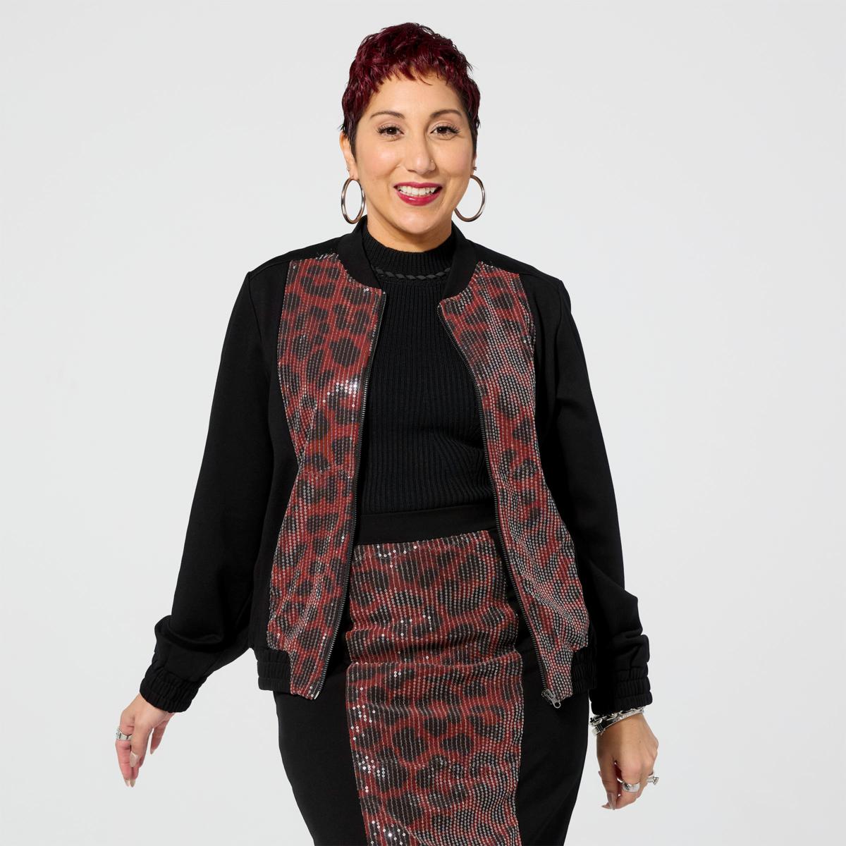 You'll love the way sleek and chic ponte knit just barely tames the vibrant animal print that makes this sequined bomber such a fun statement jacket.