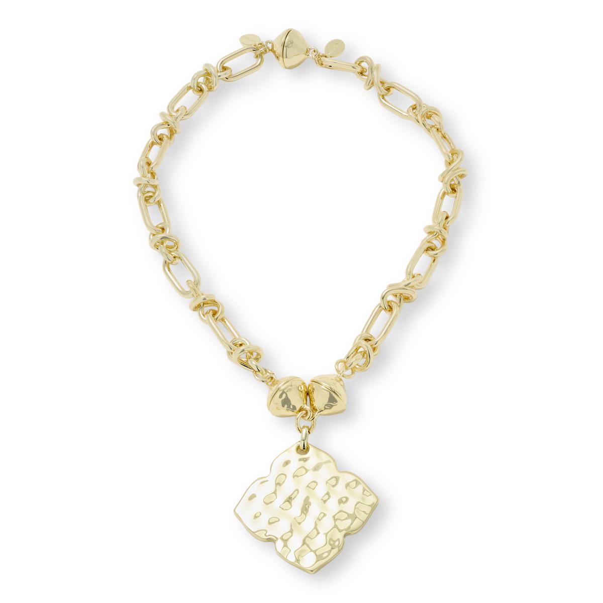 These versatile bracelets bring a touch of charm and convenience to your jewelry collection. Designed to be worn as two separate bracelets or transformed into a necklace with or without the pendant, they offer multiple styling options for any occasion. The polished and hammered gold-tone finish adds a sophisticated shine that complements any outfit.