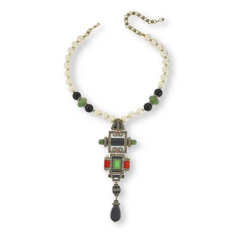 Colored glass, enamel and diamond-like clear crystals converge in this elaborate faux pearl bead necklace design from Heidi Daus. The piece features a stacked, goldtone center that's an eclectic combination of green, black and orange glass stones. The result is a luxurious look that's regal and rich.