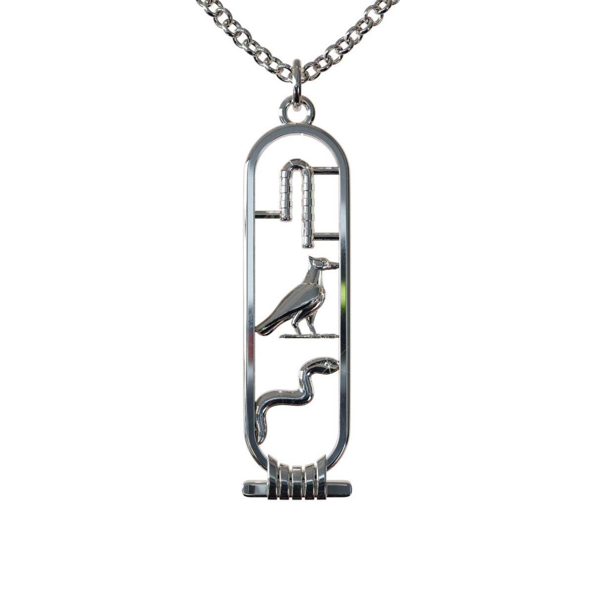 Flaunt your unique style with this beautiful, sterling silver cartouche necklace. You can personalize the cartouche with your choice of hieroglyphics that correspond with your English initials.