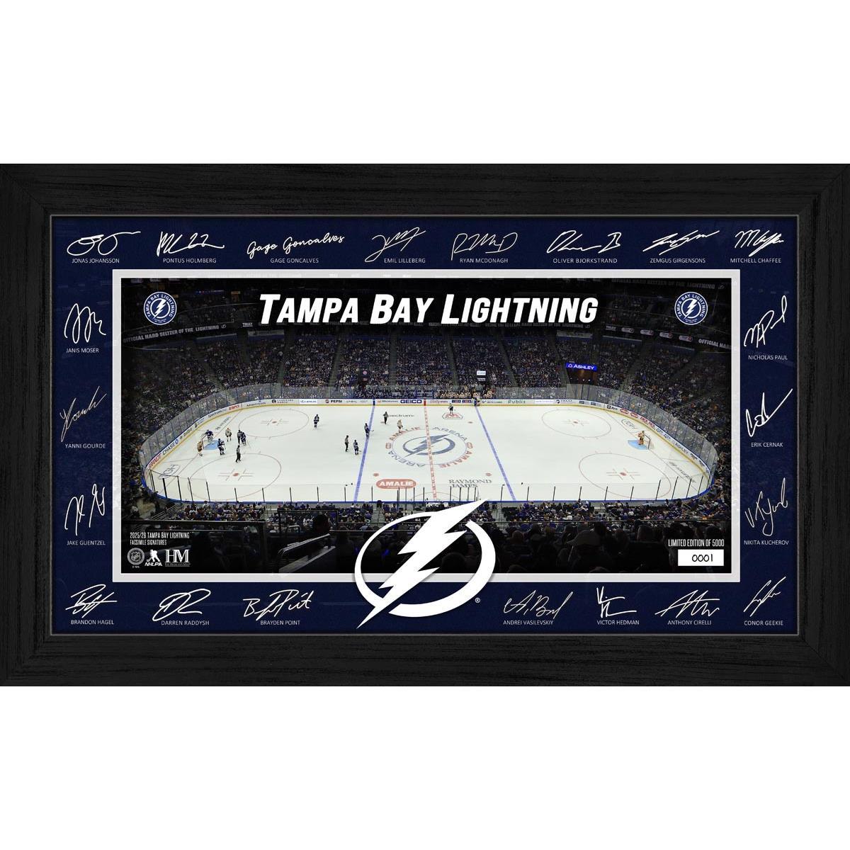 Celebrate your favorite hockey team with this stunning framed collectible featuring facsimile signatures of most Tampa Bay Lightning players. The detailed rink image surrounded by player signatures makes it a perfect centerpiece for any fan’s space. Limited to 5,000 individually hand-numbered pieces, it comes with a certificate of authenticity and is officially licensed by the NHL and NHLPA.