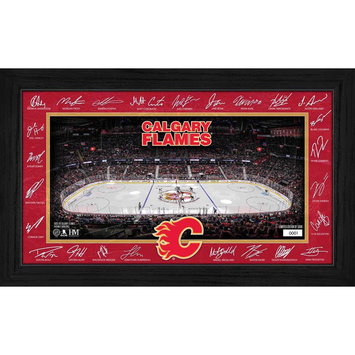 Celebrate your Flames pride with this stunning framed display featuring facsimile signatures of most players surrounding a detailed image of their home rink. Limited to 5,000 pieces, each collectible is hand-numbered and protected under plexiglass for lasting beauty. It’s a perfect addition to any fan’s collection and comes with a certificate of authenticity.