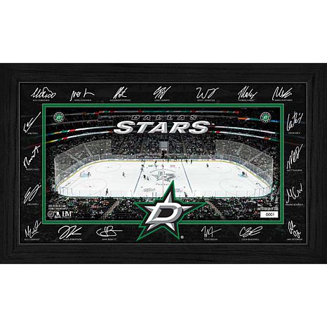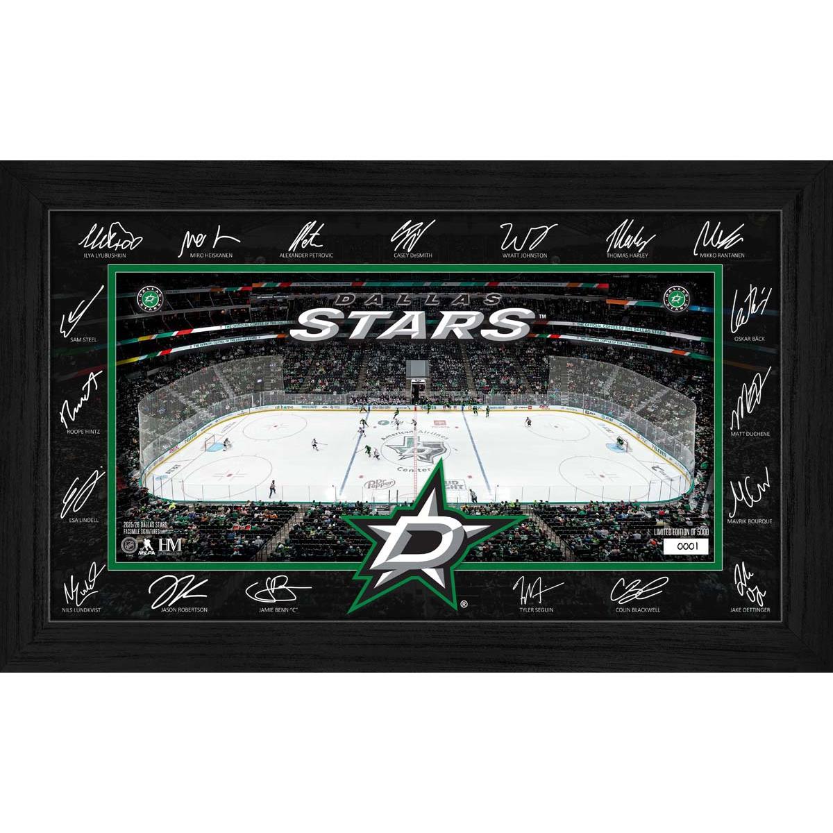 Celebrate your favorite team with this stunning framed display featuring facsimile signatures of most Dallas Stars players around a detailed image of their home rink. Each piece is individually hand-numbered and protected under plexiglass, making it a prized addition to any fan’s collection. Limited to 5,000 pieces, it comes with a certificate of authenticity and is officially licensed by the NHL and NHLPA.