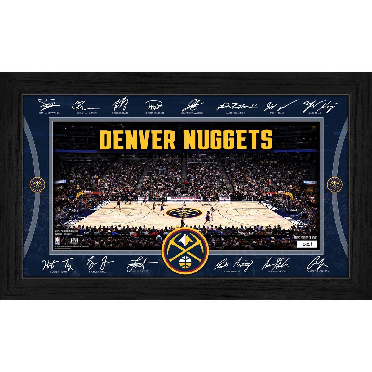 Celebrate your team spirit with this exclusive Denver Nuggets Signature Court print, featuring exact replica signatures of most 2025 players around their home court. Each limited edition print is hand-numbered and arrives ready to display in a sleek 12" x 20" wood frame with a plexi-glass front. Perfect for any fan’s collection or game room, this officially licensed piece brings the excitement of the season right to your walls.
