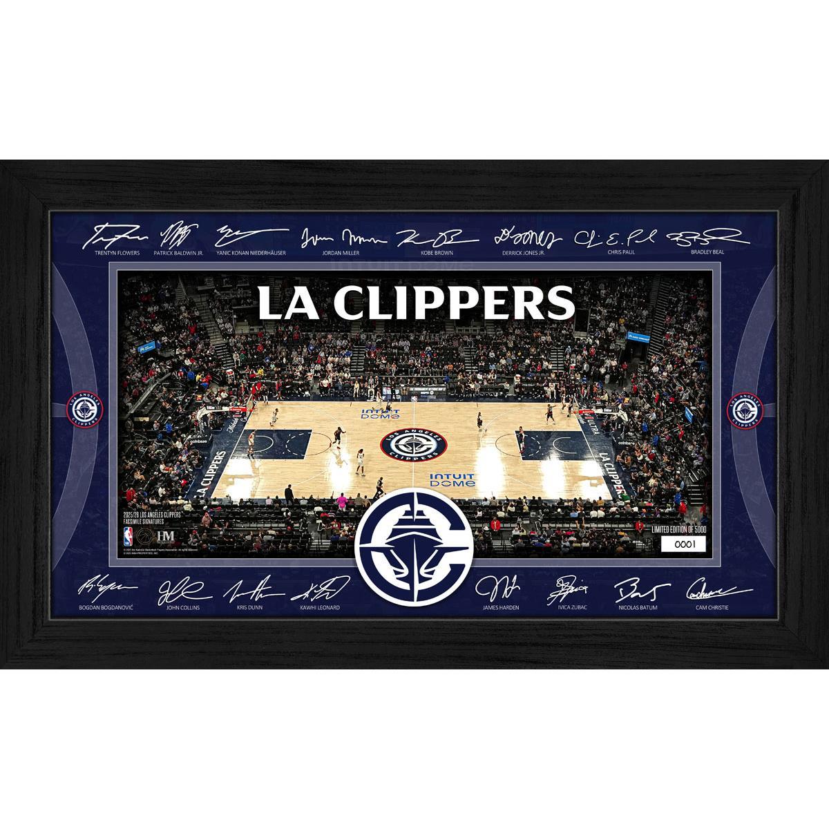 Celebrate your favorite team with this exclusive Los Angeles Clippers Signature Court print, featuring exact replica signatures of most 2025 players around the home court. Each limited edition print is hand-numbered and arrives ready to display in a sleek 12" x 20" wood frame with a plexi-glass front panel. Officially licensed and made in the USA, it’s a must-have for any Clippers fan looking to showcase team pride in style.