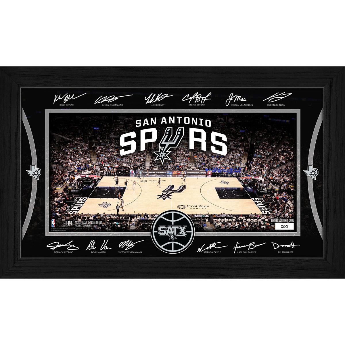 Celebrate your Spurs pride with this limited edition framed print featuring exact replica signatures of most players from the 2025 roster. Perfectly sized at 12" x 20", it arrives ready to display in a sleek wood frame with plexi-glass front. This officially licensed collectible adds a stylish and authentic touch to any fan’s space.