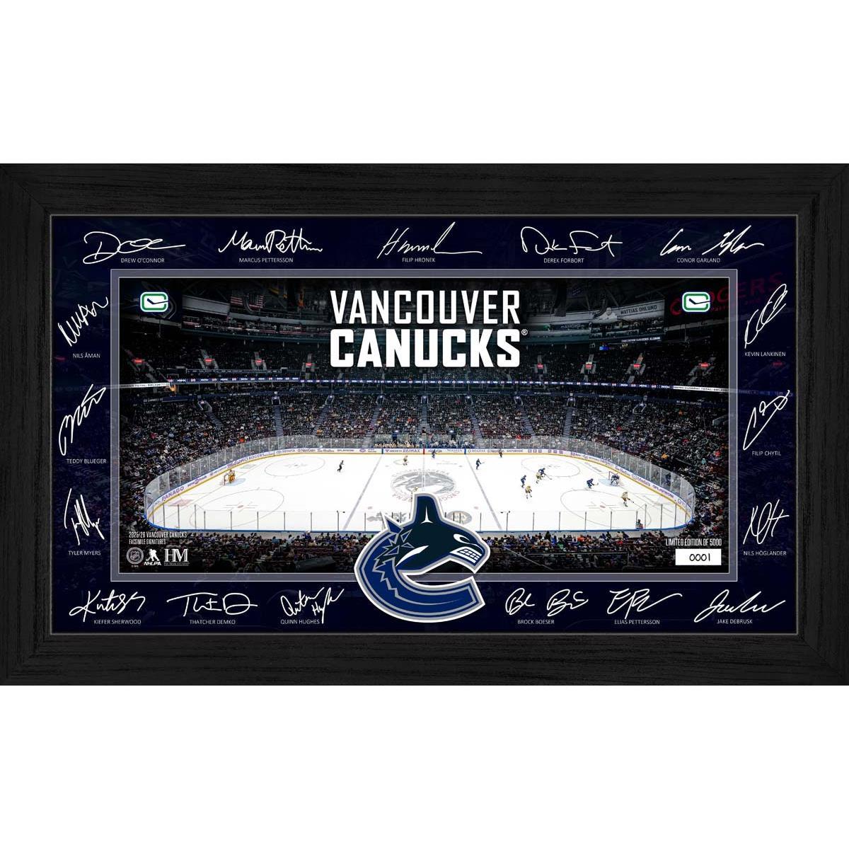Celebrate your team spirit with this stunning framed display featuring facsimile signatures of most Canucks players surrounding a detailed image of their home rink. Each piece is individually hand-numbered and protected under plexiglass, making it a prized collectible for any fan. Limited to 5,000 pieces, it comes with a certificate of authenticity and is officially licensed by the NHL and NHLPA.