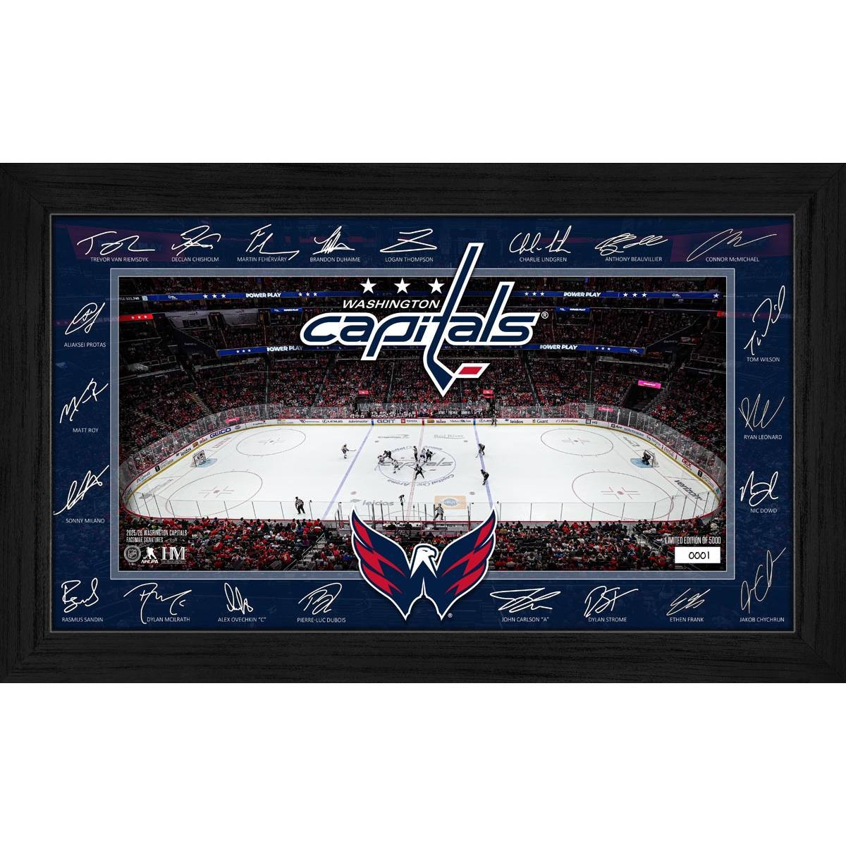 Celebrate your Capitals pride with this stunning framed display featuring facsimile signatures of most players surrounding a detailed image of their home rink. Limited to 5,000 pieces, each collectible is hand-numbered and protected under plexiglass for lasting beauty. It’s a perfect addition to any fan’s collection and comes with a certificate of authenticity.