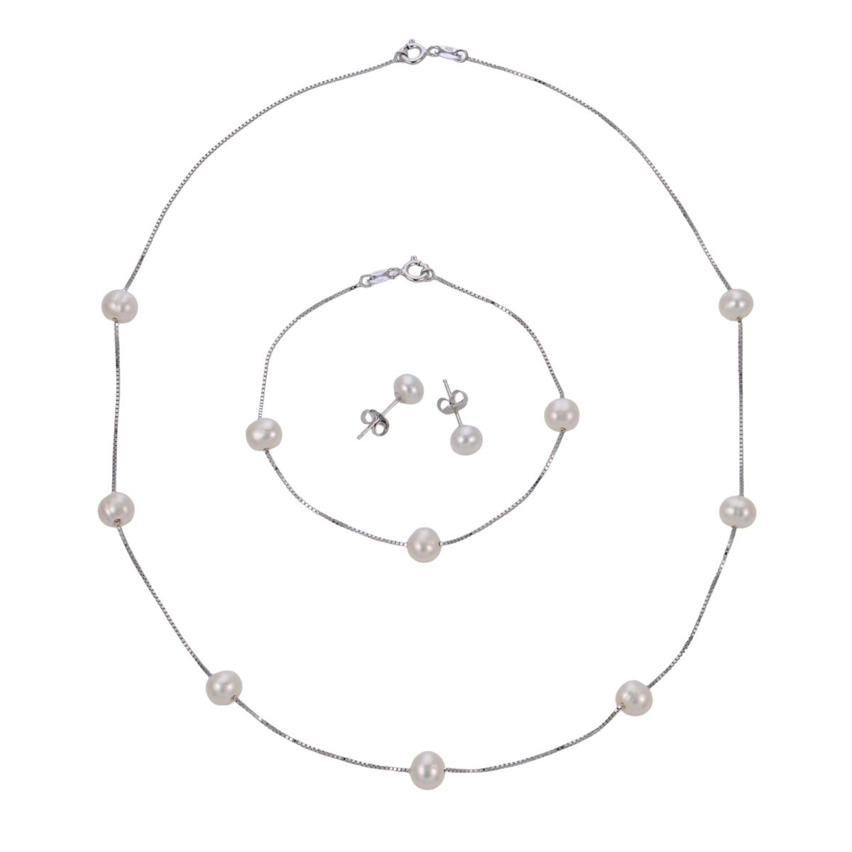 Unveil a touch of elegance with the Imperial Pearls Cultured Pearl Station jewelry Set, featuring a necklace, bracelet, and stud earrings adorned with lustrous freshwater cultured pearls. This stunning set seamlessly transitions from day to night, offering a refined addition to any jewelry collection. With secure spring ring clasps on the necklace and bracelet and butterfly backs on the earrings, you're assured of both style and comfort.