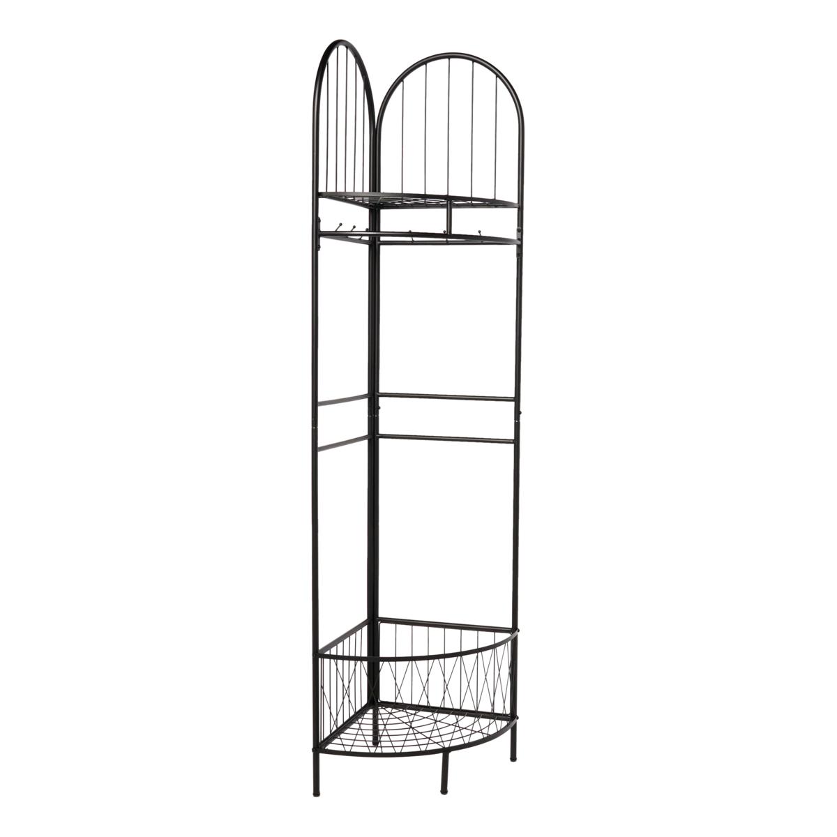 It features a top shelf with hanging bar, six hanging knobs and a bottom basket. The upper shelf can be used to place plants, decorations, handbags or accessories, while the hanging bar allows for smaller items such as scarves to be draped over or even hangers with garments.