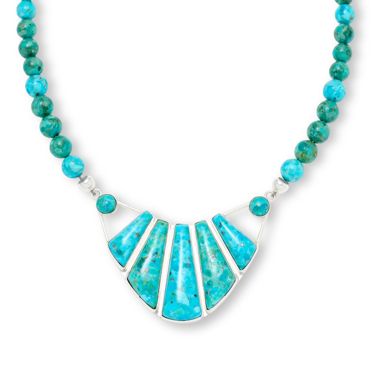 This standalone necklace showcases a sterling silver setting inlaid with vibrant, manmade Heavenly Well Lake turquoise, flanked by matching round beads. Its polished finish and hook clasp make it a versatile piece that effortlessly elevates any outfit. Perfect for adding a splash of natural color to your everyday look or special occasions.