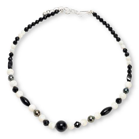Gray Tahitian pearls provide an elevated tone to this stunning necklace of black chalcedony and white mother-of-pearl beads. Its classic color combination makes an elegant topper to any ensemble. From Jay King.