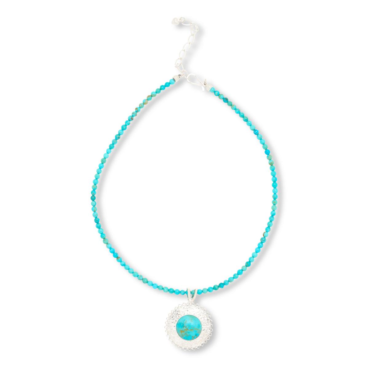 Add a pop of pretty turquoise color to your neckline with this handcrafted pendant and beaded necklace combination. The pendant features a round, compressed Kingman turquoise cabochon bezel-set into a textured sterling silver frame, while the single-strand necklace is comprised of 4mm beads. Wear them together or separately for a variety of chic, stylish looks.