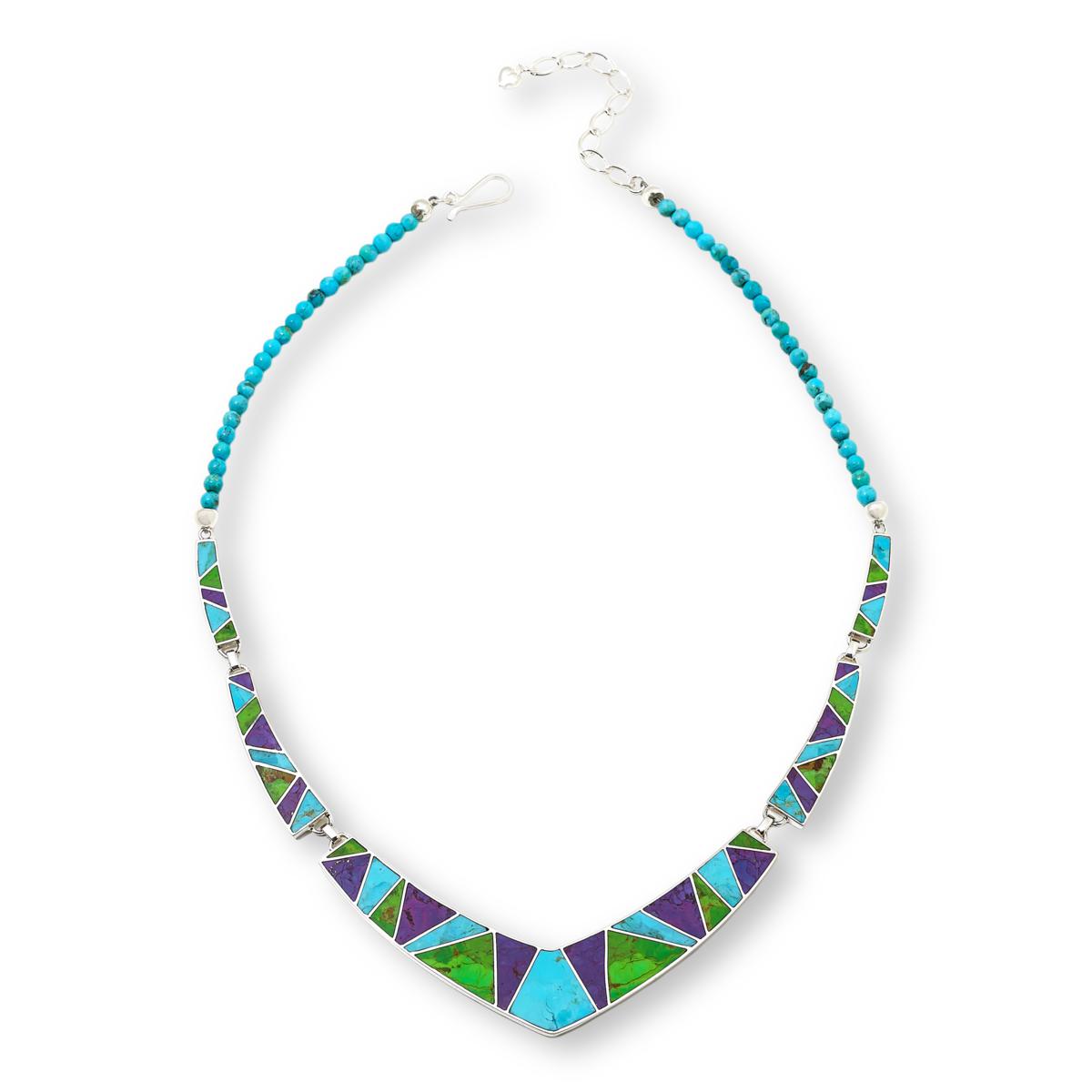 - Sterling silver necklace drape has V-shaped center station linked to four additional stations, each with geometric inlay pattern of green, blue and purple turquoise