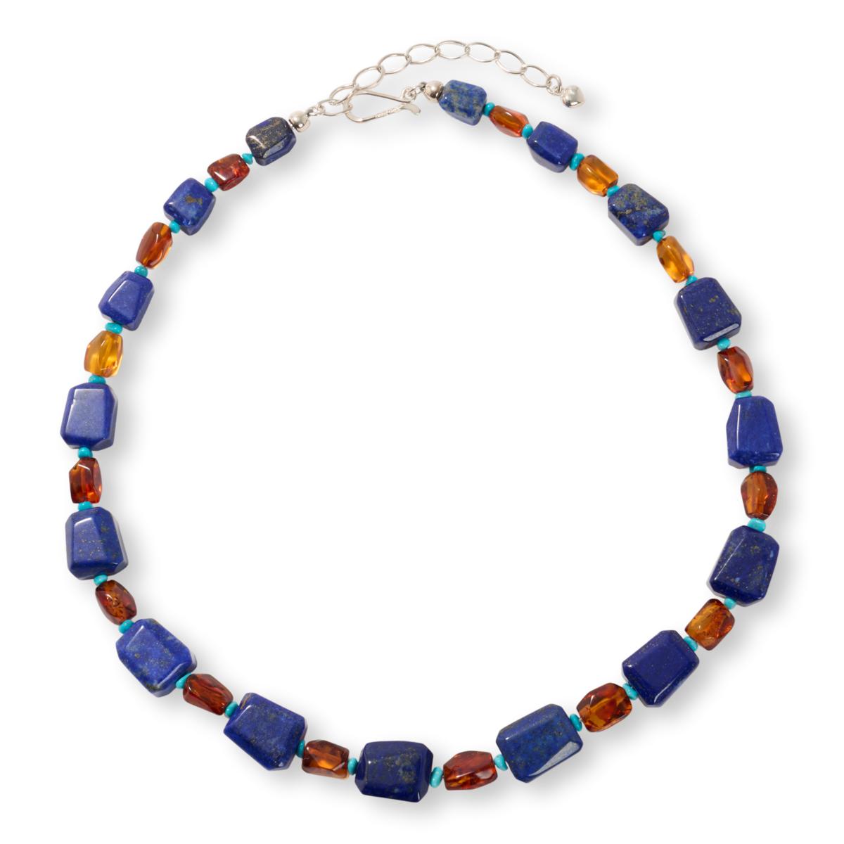 - Necklace has squarish lapis beads, brown amber and turquoise beads strung in alternating pattern