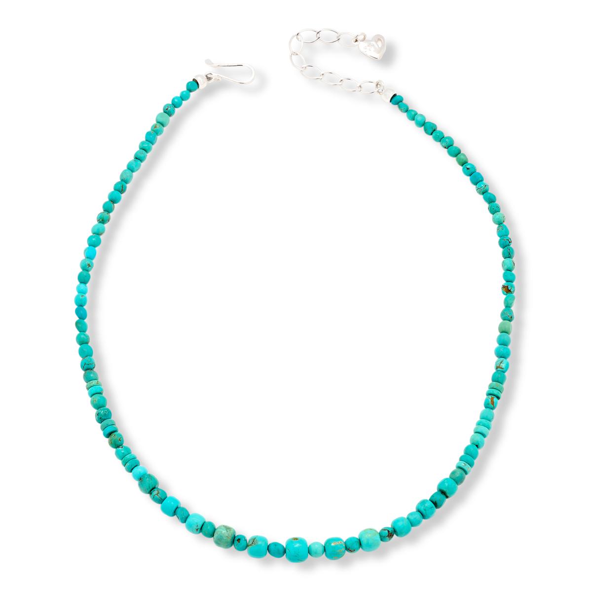 - Single strand necklace comprised of freeform, disc- and nugget-shaped turquoise beads