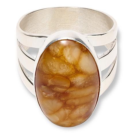 Enjoy the unique look of butterscotch amber when you slip on this lovely, sterling silver ring. The handcrafted piece showcases an oval cabochon of amber composite with swirling shades of brown and yellow. From Jay King.