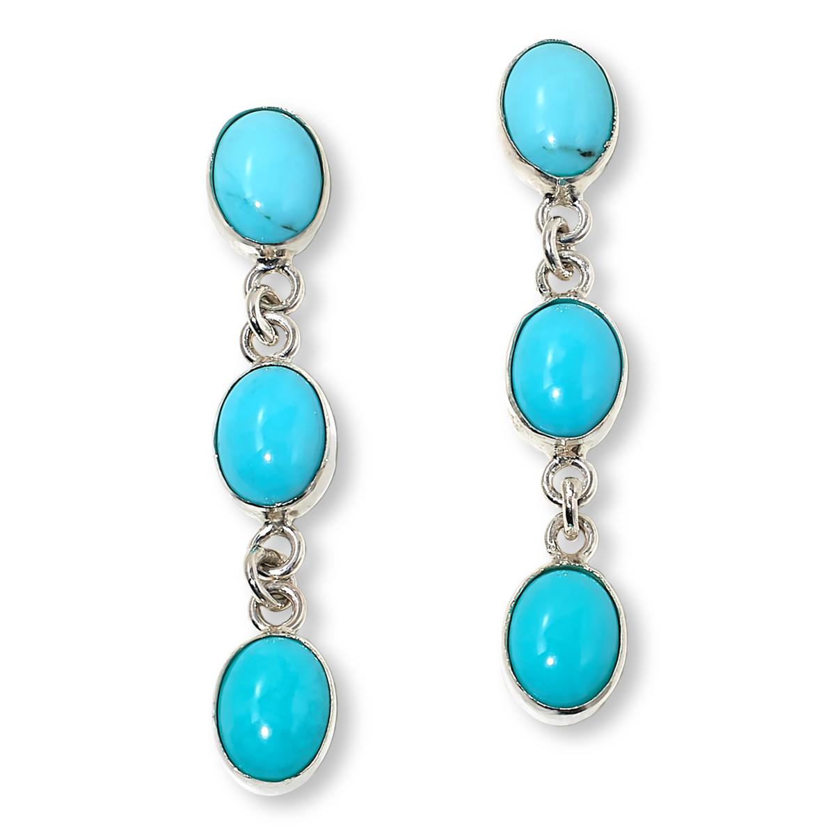 - Sterling silver earrings each have three bezel-set, oval turquoise cabochons linked together