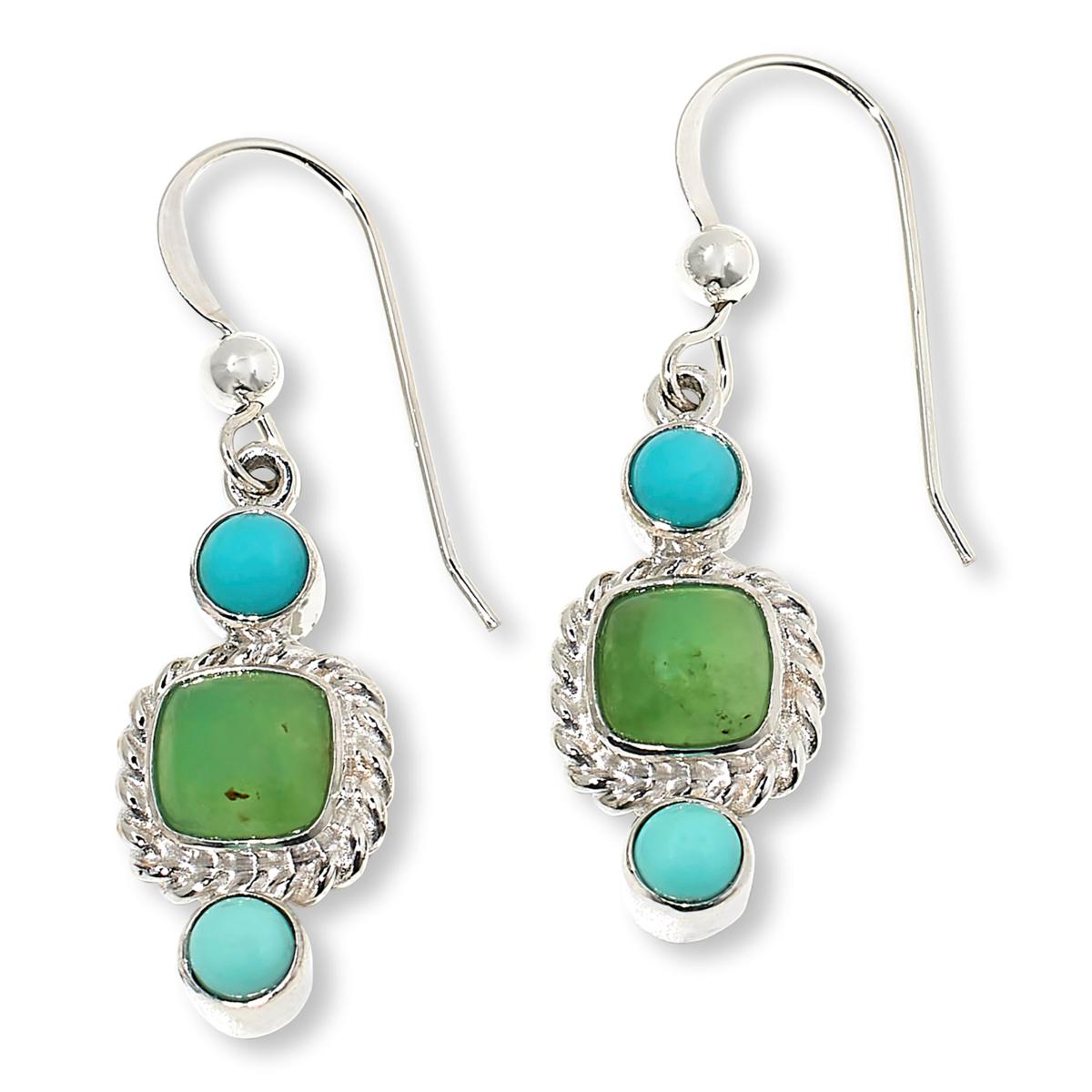 - Earring drops each have cushion-cut green chrysoprase stone set between two round turquoise cabochons
