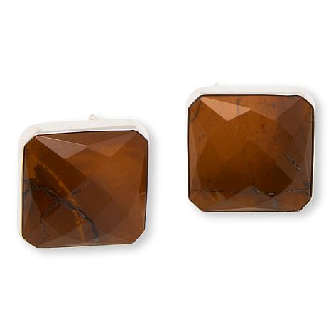 - Earrings have cushion-shaped, faceted brown chalcedony stones
