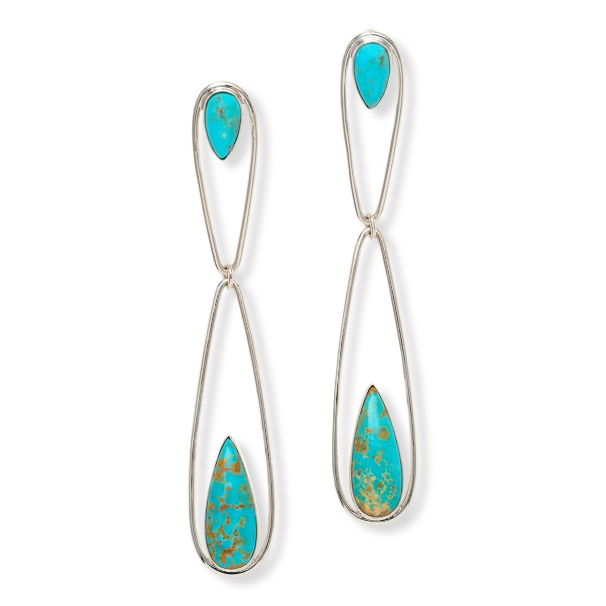 - Earrings each have two bezel-set, pear-shaped turquoise with gold matrix stones