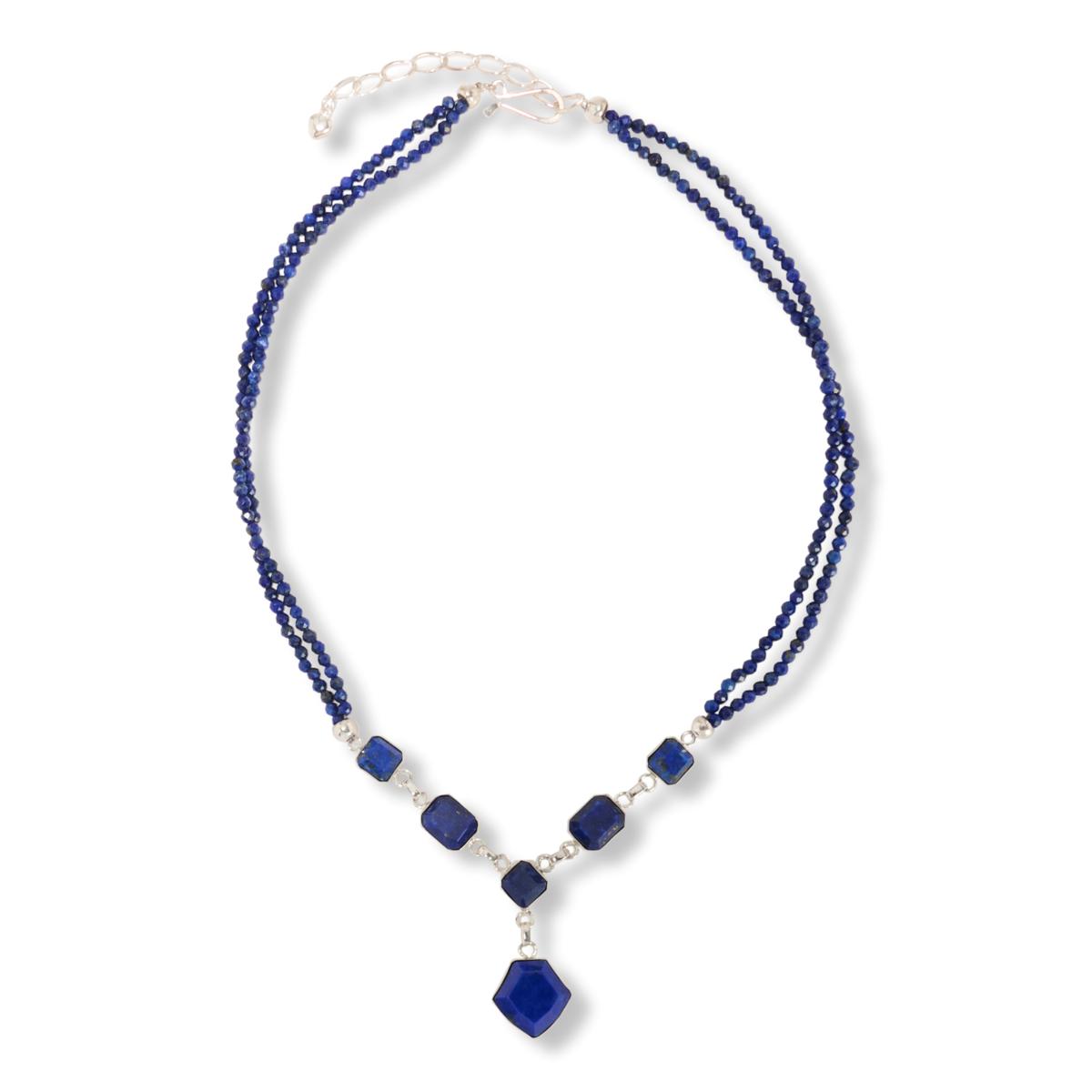 - Two strands of round, faceted lapis beads complete necklace