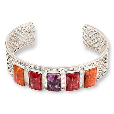 Accessorize your wrist with a fun pop of natural gemstone color when you slip on this handcrafted, sterling silver cuff bracelet. The artistic piece features purple, red and orange spiny oyster shell stones bezel-set atop an open, lattice-work base. From Jay King.