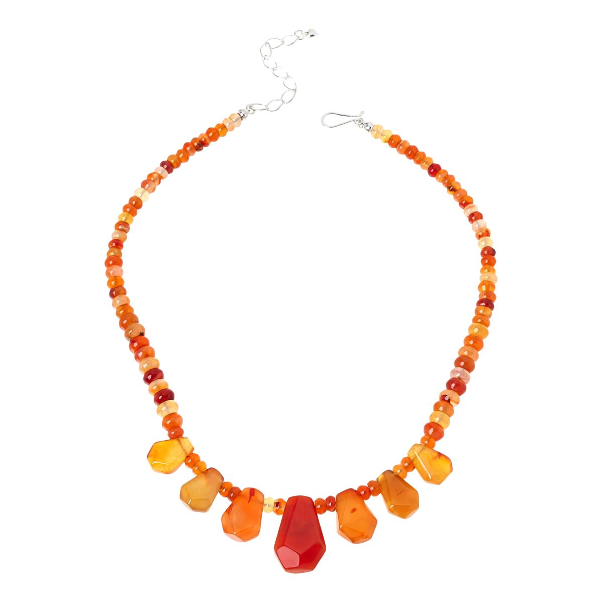 - Orange-red chalcedony necklace has seven freeform stone stations along drape