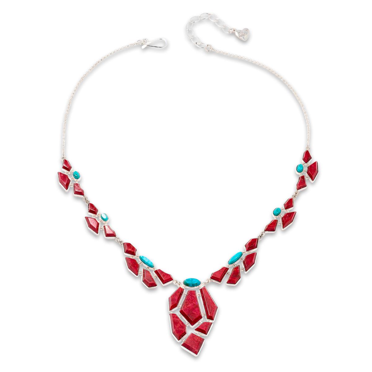 Rich, red coral originally harvested from the oceans of Indonesian, pairs with brilliant blue Sonoran turquoise in this unique necklace design. Handcrafted from polished sterling silver, this colorful piece features mosaic-like stations that are sure to compliment your eclectic style. From Jay King.