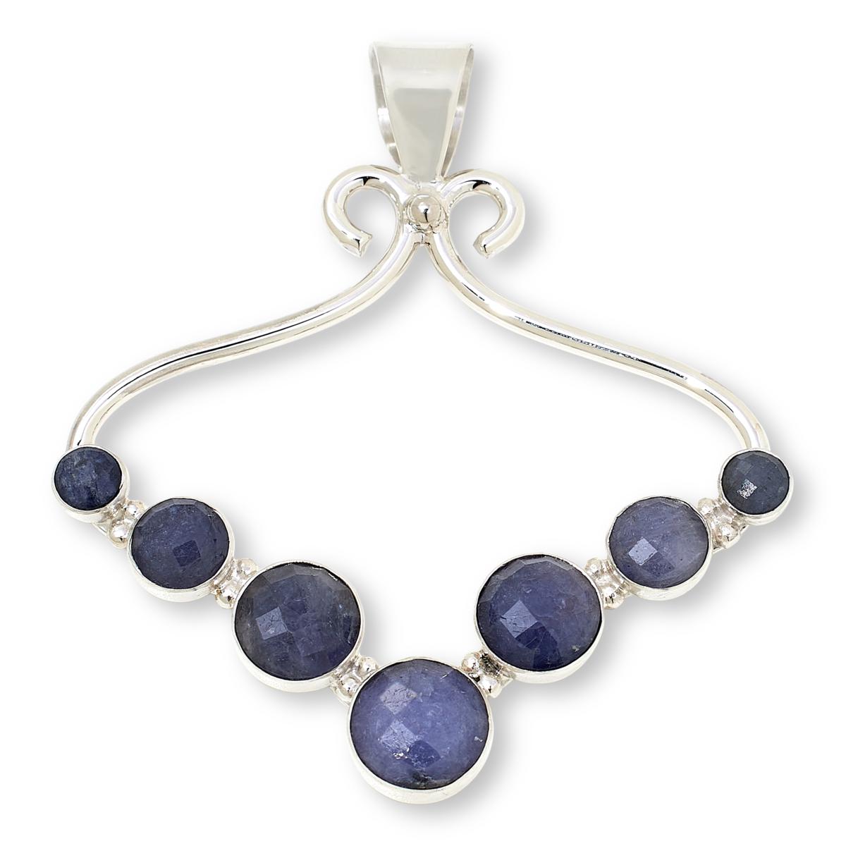 - Sterling silver pendant is open, silver shape with round, faceted tanzanite stones bezel-set along base point
