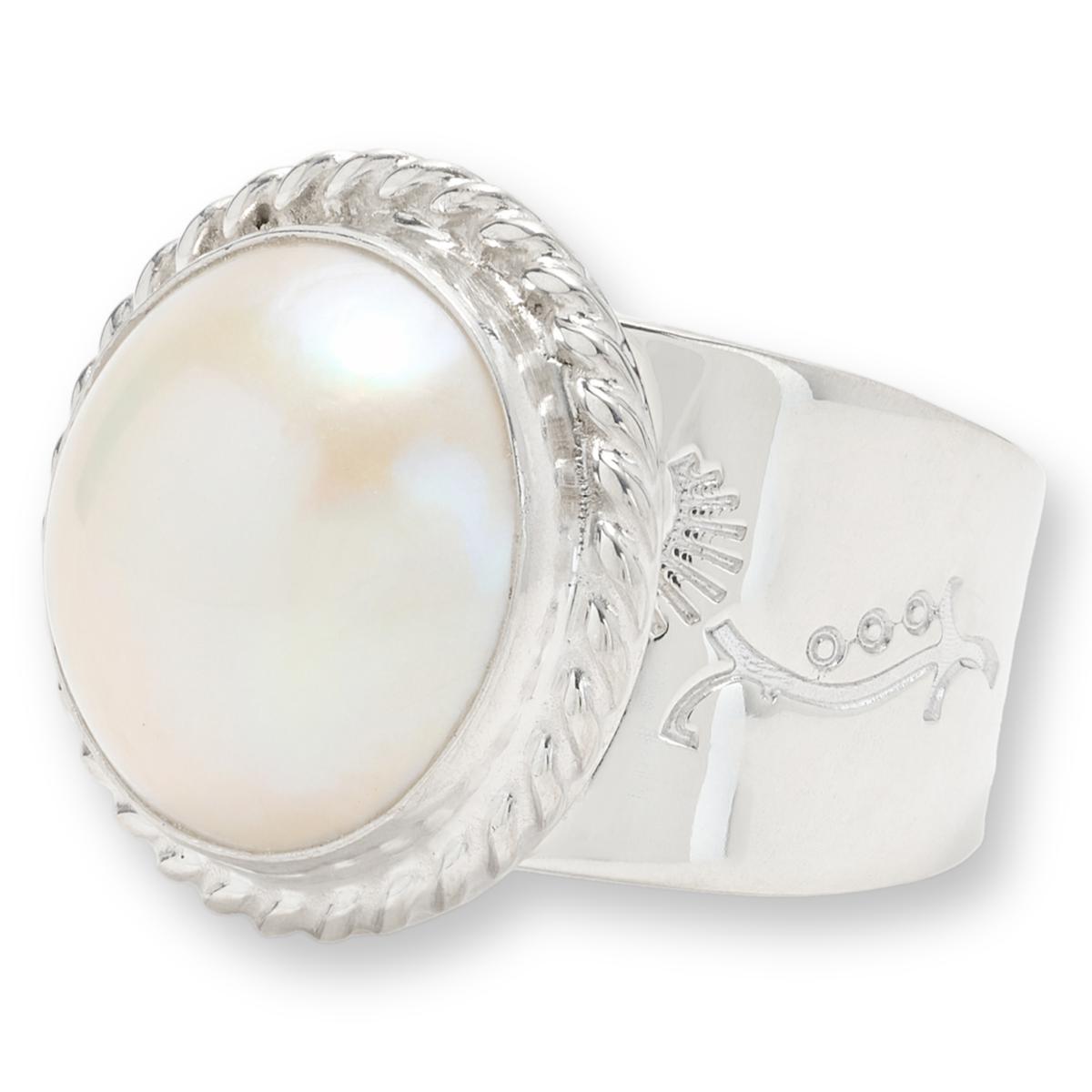 - Sterling silver ring has round, white Mabé pearl bezel-set in rope-textured frame atop wide band