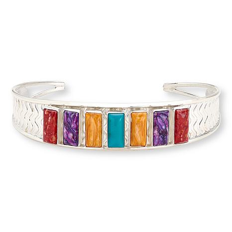 Add a rainbow of gemstone color to your wrist with this multigemstone cuff bracelet. The handcrafted piece features a row of rectangular-cut Kingman turquoise and purple, red and orange spiny oyster shell composite sones lined up atop a wavy-textured sterling silver base.
