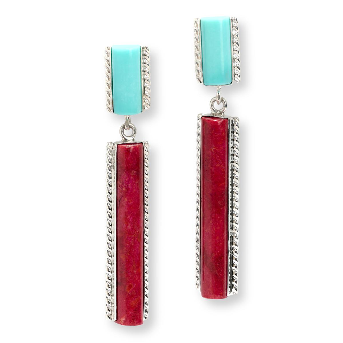 These dangle post earrings bring a splash of vibrant color with rectangular cabochons of Campitos turquoise and Indonesian red coral set in polished sterling silver. Perfect for adding a natural, earthy touch to your everyday look or dressing up for a special occasion. Lightweight and eye-catching, they’re a versatile addition to any jewelry collection.