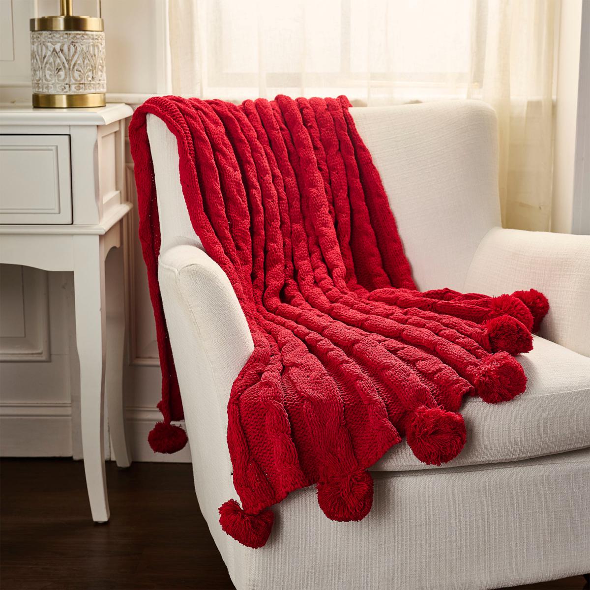 The chunky cable knit throw is fringed with decorative pom-poms for a playful twist on classic design. Soft chenille yarns are knitted in a warm, high-touch texture making this throw a comforting addition to any living room sofa, loveseat, or master suite.