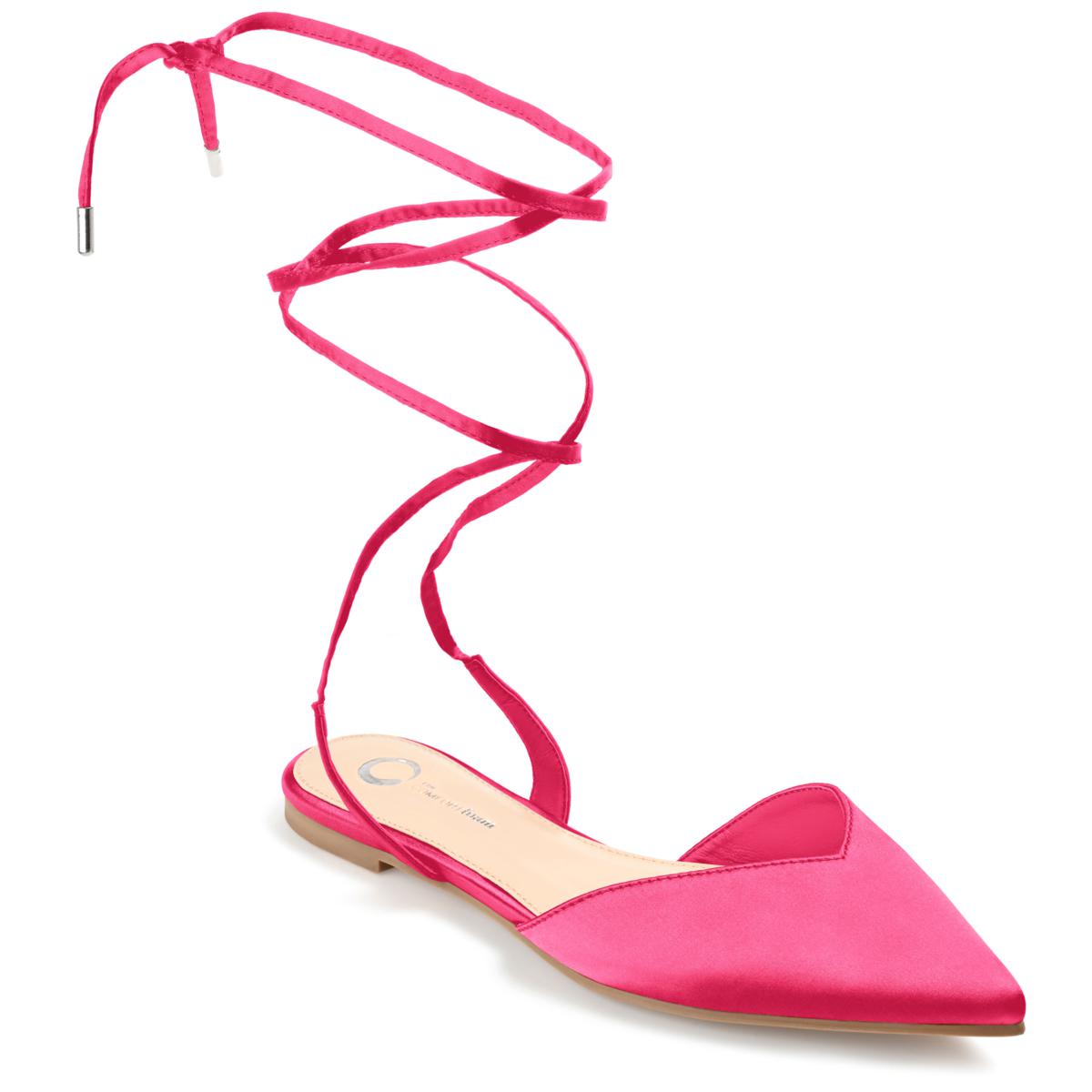 A party look without the fuss, the Theia by Journee Collection. This pointed-toe flat features silky satin uppers topped with a wraparound tie at the ankle for a ballet-inspired look. A 4 mm Tru Comfort Foam™ insole grounds the design for extra support.