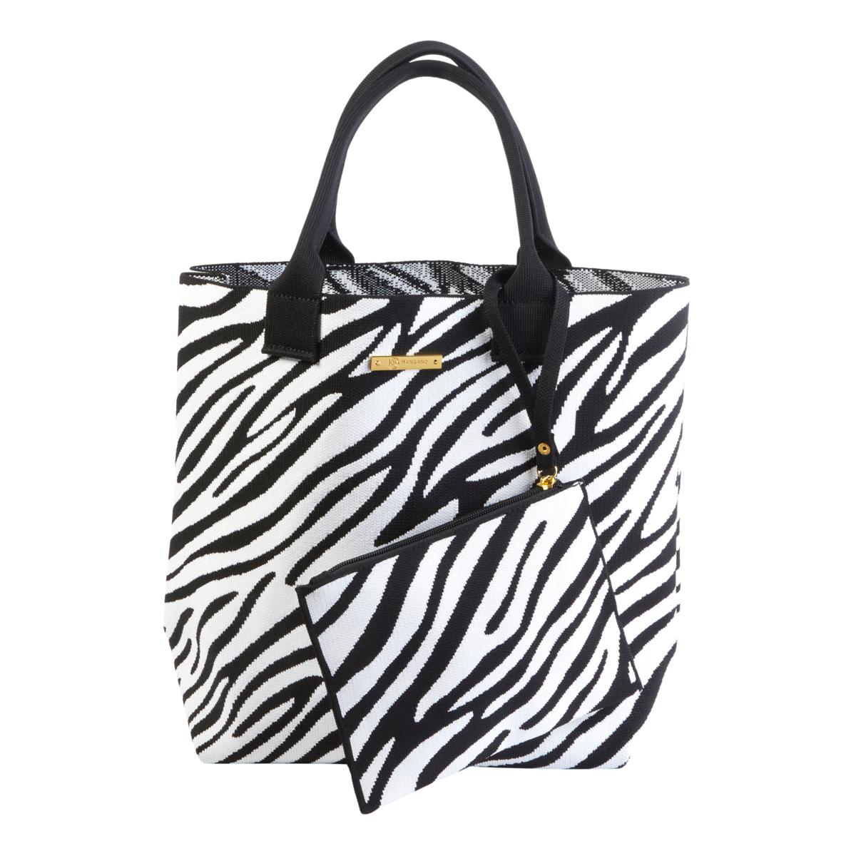 Joy Mangano has been inventing and designing products for more than 25 years. Roomy but not bulky, this iconic tote is made of a fly knit in an exotic zebra print. Sturdy, comfortable dual carry handles easily fit over the shoulder or arm. The handy matching wristlet can be used separately in any capacity that suits your needs.