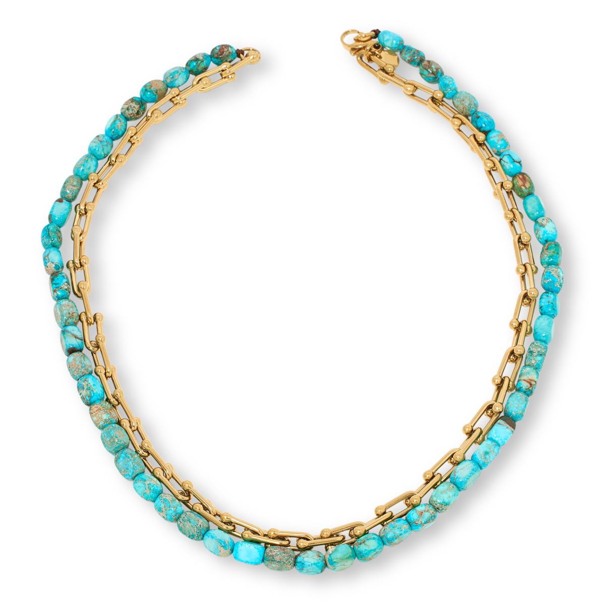 Fab for making a look, this layered necklace showcases a row of gemstone beads and a row of designer chain links. So great on its own or for piling on with other necklaces to make a dramatic stack.