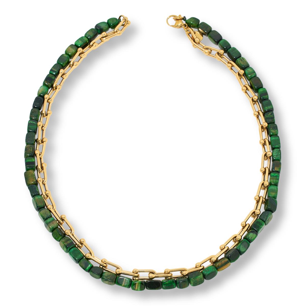 Fab for making a look, this layered necklace showcases a row of gemstone beads and a row of designer chain links. So great on its own or for piling on with other necklaces to make a dramatic stack.