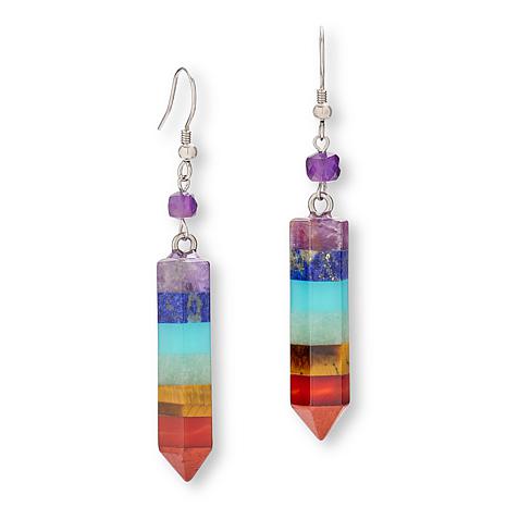 Bring a splash of fun color and unique flair to your look with these vibrant gemstone drop earrings. The earrings feature obelisk-shaped drops made from compressed natural stones including amethyst, jasper, agate, tiger eye, prehnite, aquamarine, and lapis.