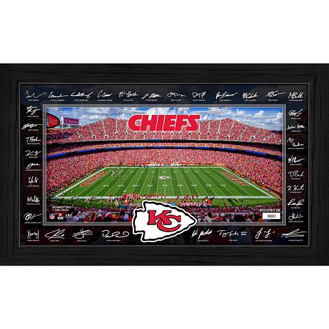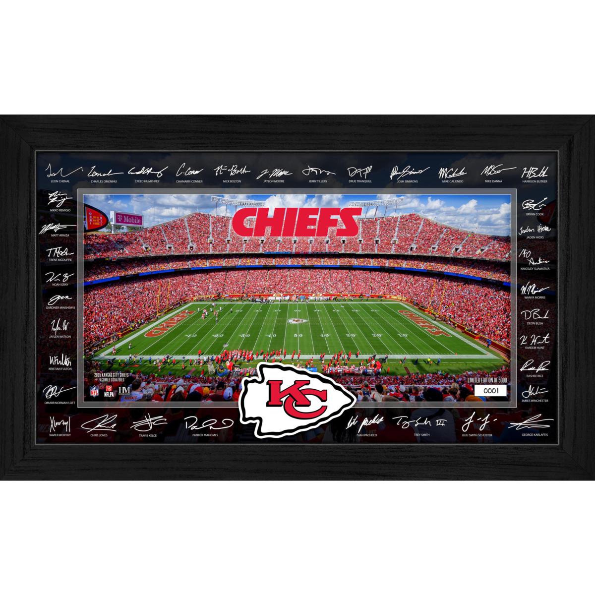 Display your fandom in style with this 12" x 20" Signature Gridiron frame, showcasing an individually hand-numbered print of the Kansas City Chiefs home field and surrounded by the facsimile (replica) signatures of most of the 2025 team roster. Elegantly presented under acrylic glass, this officially licensed collectible is a limited edition of 5,000 (and accompanied by a certificate of authenticity).