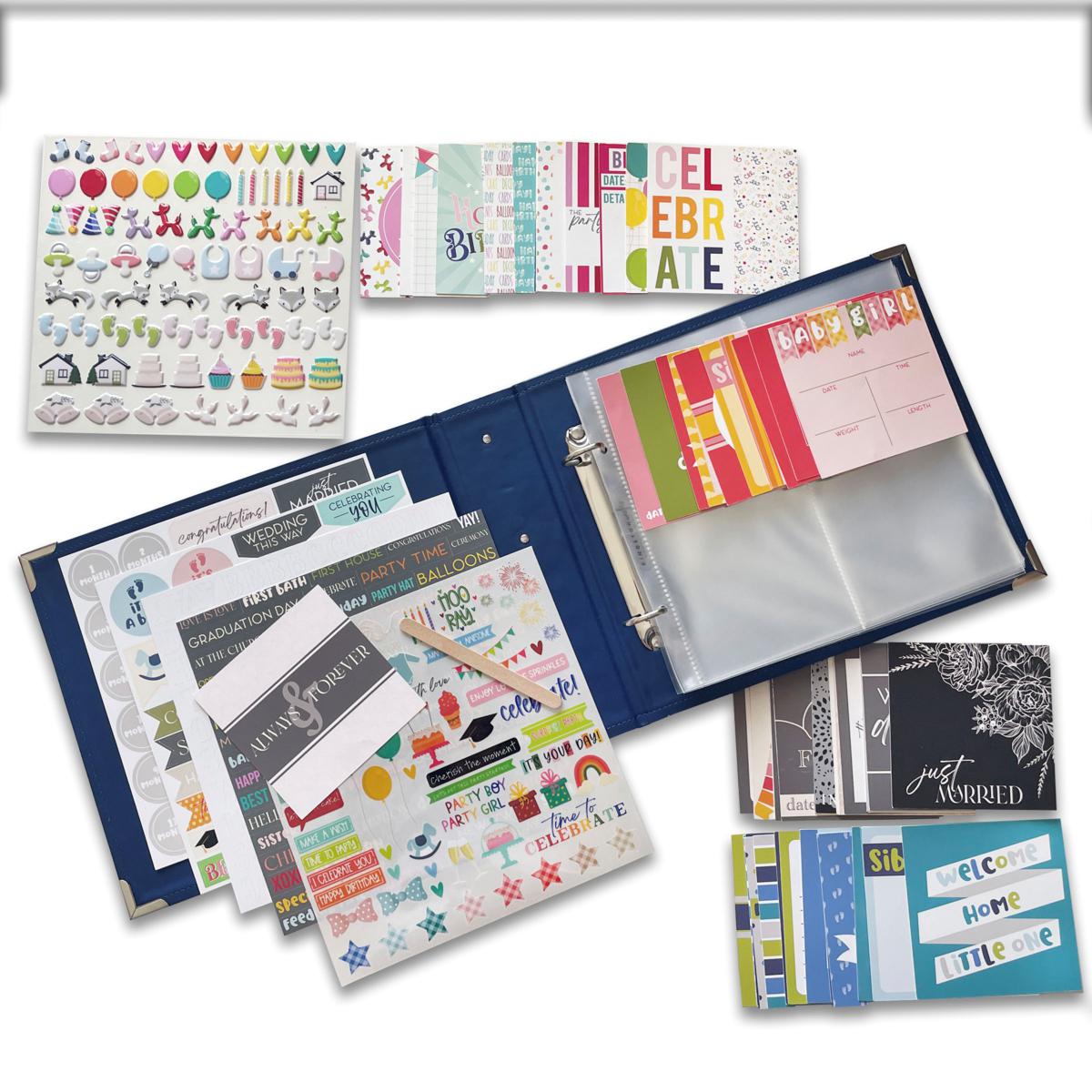 Need an album kit? Keep it simple and just add photos and journaling inserts or use the stickers, inserts and rub-ons to add some flair to your album. The divided page protectors hold the printed inserts and photos to easily record memories and add photos to the album and the double-sided cards that take you all through the year, making it easy to record memories of your favorite celebrations, including wedding, baby, birthdays and more.
