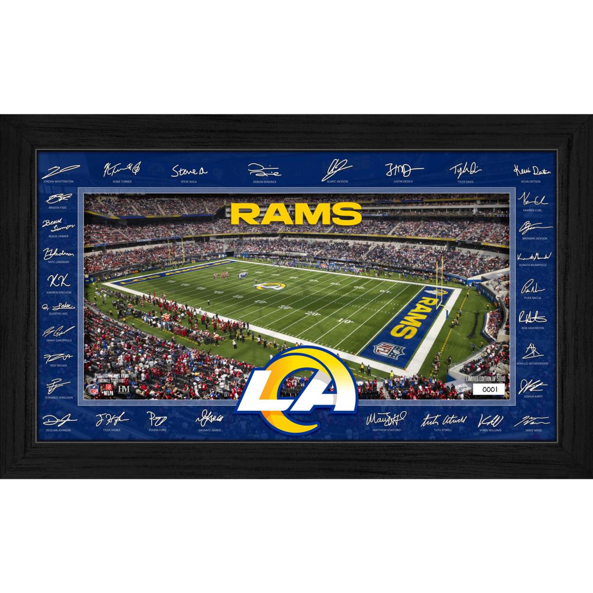 Display your fandom in style with this 12" x 20" Signature Gridiron frame, showcasing an individually hand-numbered print of the Los Angeles Rams home field and surrounded by the facsimile (replica) signatures of most of the 2025 team roster. Elegantly presented under acrylic glass, this officially licensed collectible is a limited edition of 5,000 (and accompanied by a certificate of authenticity).