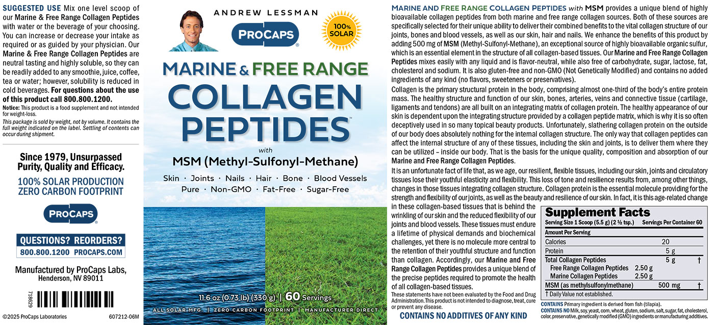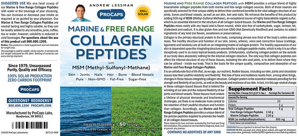 Andrew Lessman's Marine and Free Range Collagen Peptides with MSM provides a unique blend of highly bioavailable Collagen Peptides from both Marine and Free Range collagen sources. Both of these sources are specifically selected for their unique ability to deliver their combined benefits to the vital collagen structure of our Joints, Bones and Blood Vessels, as well as our Skin, Hair and Nails.