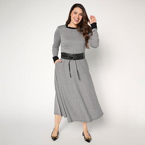 This dress offers perfect comfort with its soft jacquard knit and lined bodice, while the unlined skirt ensures ease of movement. The double-sided belt lets you switch up your look effortlessly, whether you prefer faux leather or self-fabric. Midi length and rib trim details make it versatile for day-to-night wear, pairing beautifully with boots or flats.