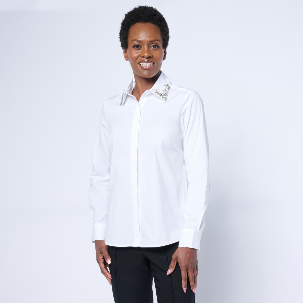 This poplin stretch shirt features a dazzling rhinestone collar that instantly elevates your look. Crafted from a cotton nylon spandex blend, it offers excellent stretch and mobility, perfect for busy days or driving. Layer it under a blazer or pair with jeans for a versatile, chic outfit.