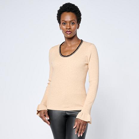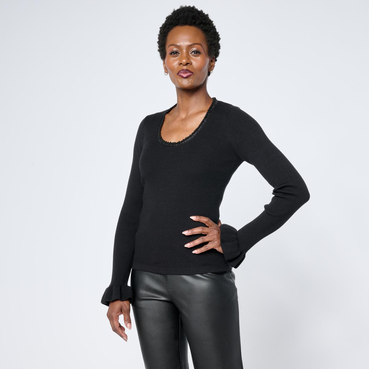 This scoop neck rib sweater features a ruffle flounce sleeve edge and elegant beading around the neckline, adding a touch of sparkle to your look. Perfect for layering under jackets or wearing on its own, it contours the body with comfortable stretch and great recovery. Whether belted or untucked, this versatile top elevates your everyday style with subtle shine and feminine flair.