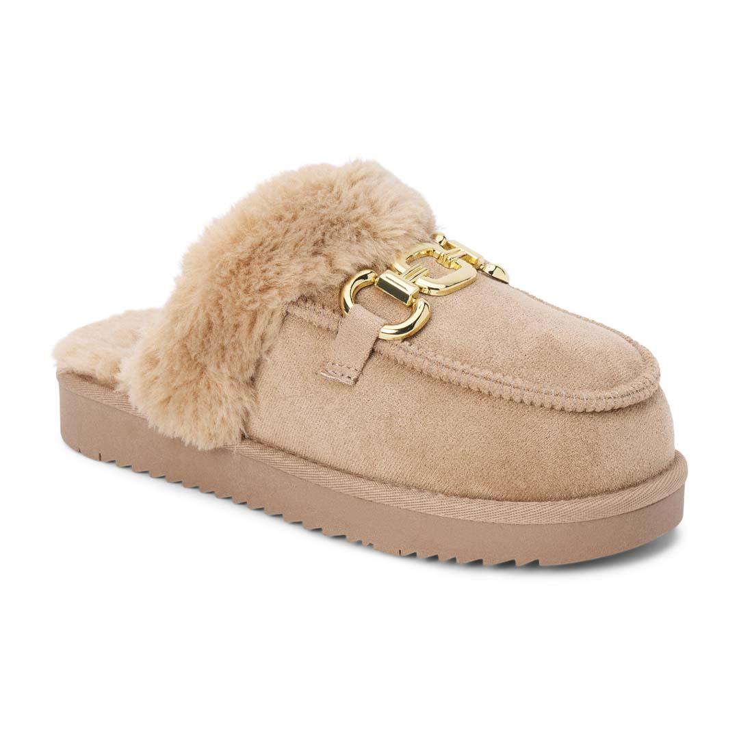 Slip into cozy comfort with this lounge mule featuring a plush faux-fur lining that keeps your feet warm and snug. The charming ornament detail adds a touch of style, making it perfect for relaxing at home or casual outings. Easy to wear and effortlessly chic, this mule is a must-have for laid-back days.