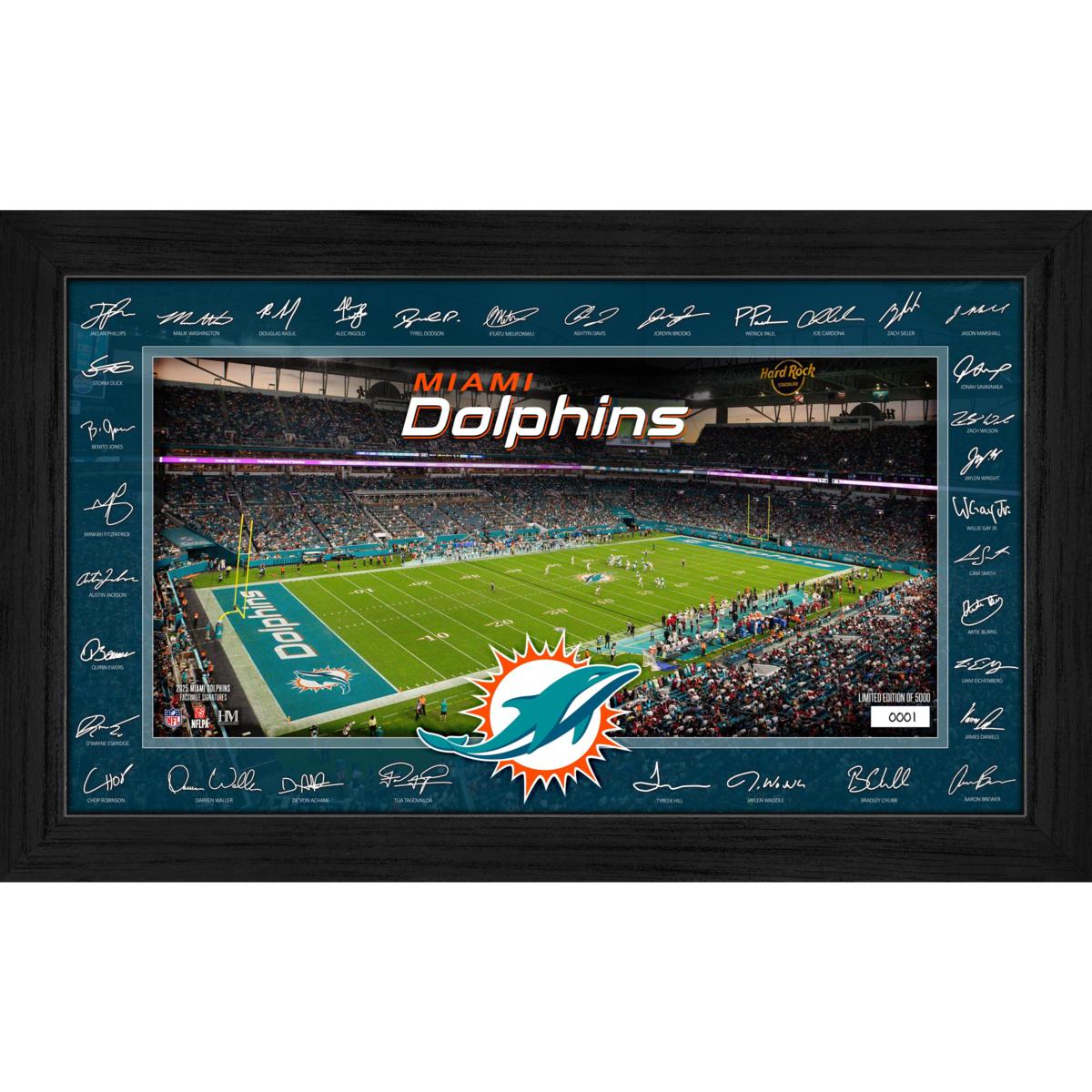 Display your fandom in style with this 12" x 20" Signature Gridiron frame, showcasing an individually hand-numbered print of the Miami Dolphins home field and surrounded by the facsimile (replica) signatures of most of the 2025 team roster. Elegantly presented under acrylic glass, this officially licensed collectible is a limited edition of 5,000 (and accompanied by a certificate of authenticity).
